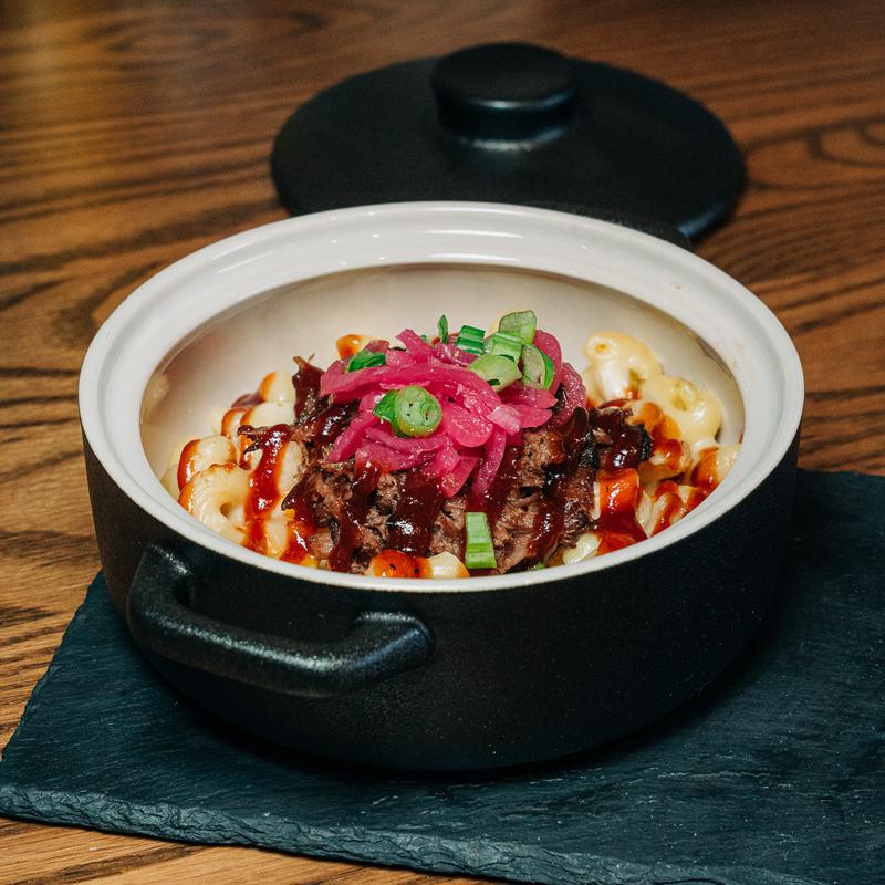 Mac and Hatch Chile cheese sauce, topped with braised beef short ribs, honey sriracha BBQ, and pickled onions.