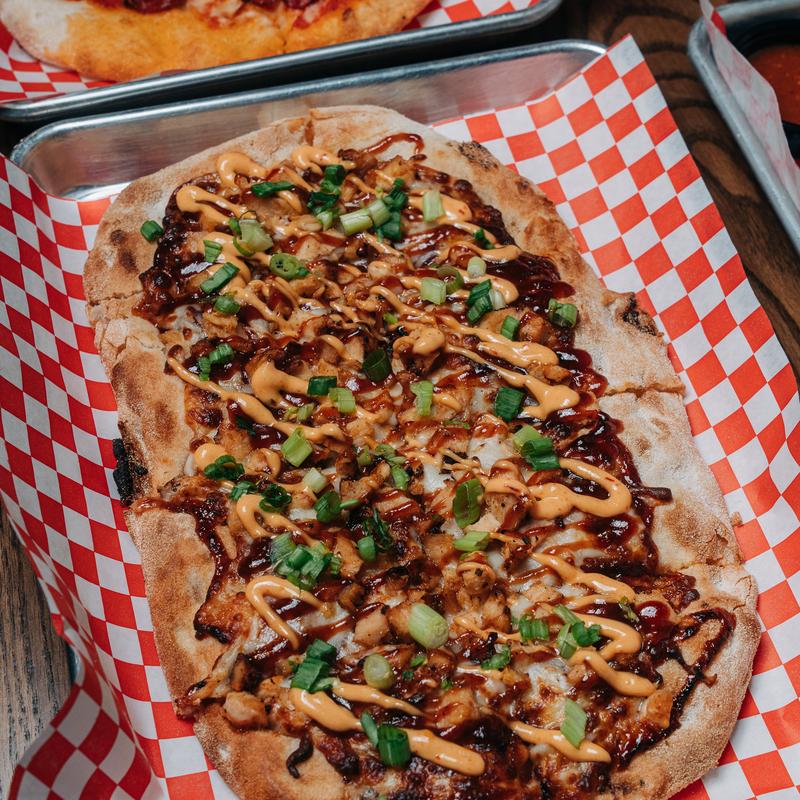 Mozzarella 'n provolone cheese, grilled chicken, honey sriracha BBQ, chipotle mayo, and green onions.
