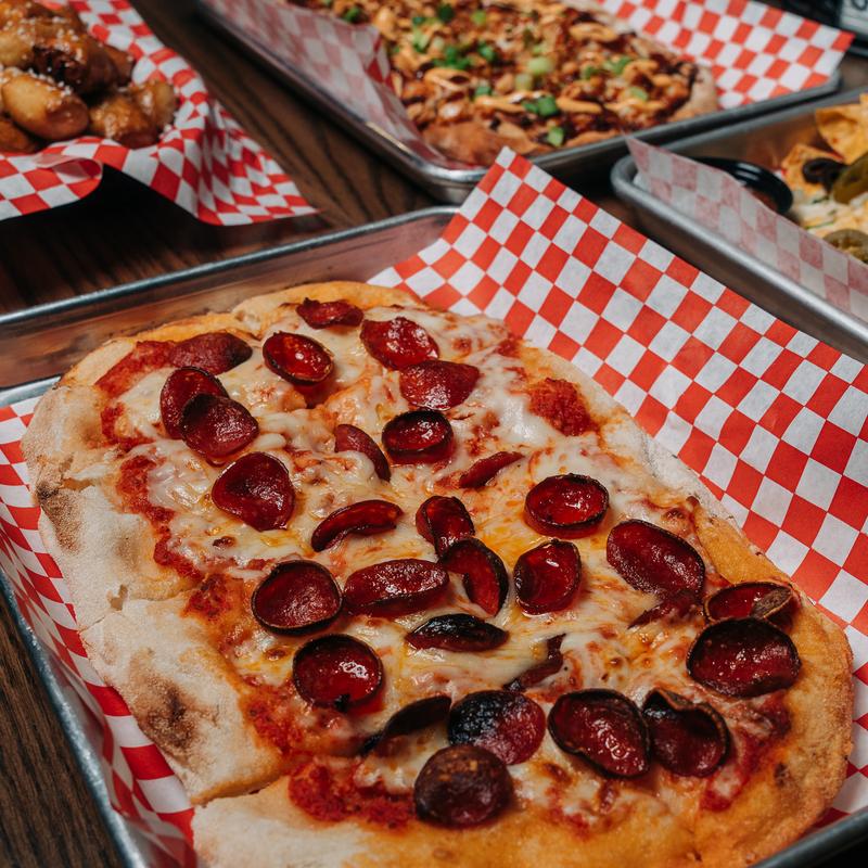 Flatbread pizza served with a tangy tomato sauce loaded with pepperoni or cheese.