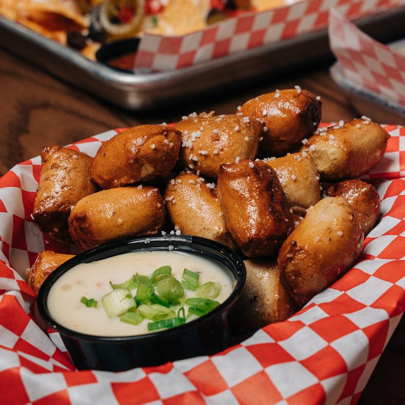 Warm pretzel bites served with house-made queso blanco there sauce.