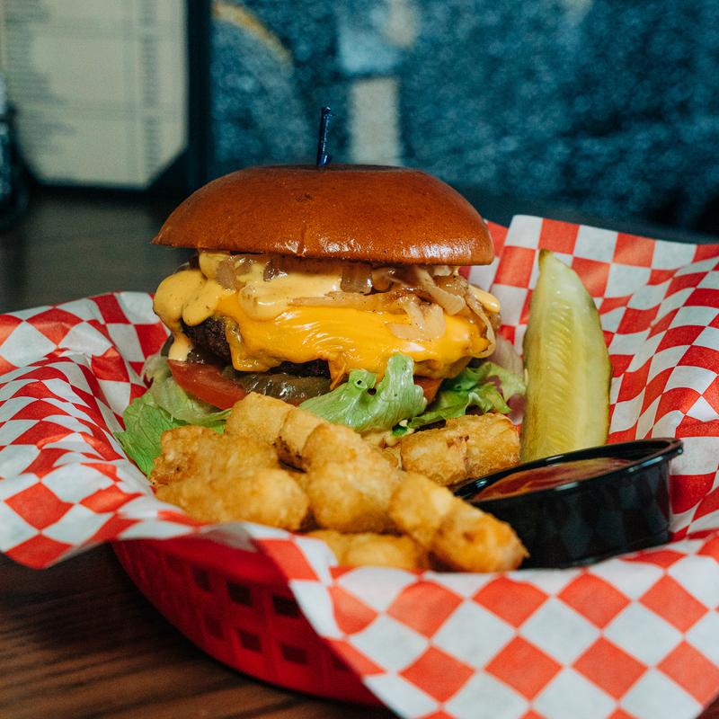 1/3 lb angus beef patty, American cheese, grilled onions, lettuce, tomato, pickles, and stadium sauce, on a buttery potato bun • Add Bacon +$2.00